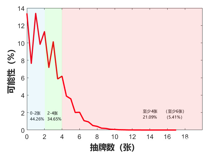 看起来不多?但是期望只是平均数,表示不了离散程度。举个例子,万灵之召有8/36的概率,也就是22%的概率直接打出一张奇迹生长过三张牌,这样说就有点吓人了。下图放出计算抽牌数的分布情况: