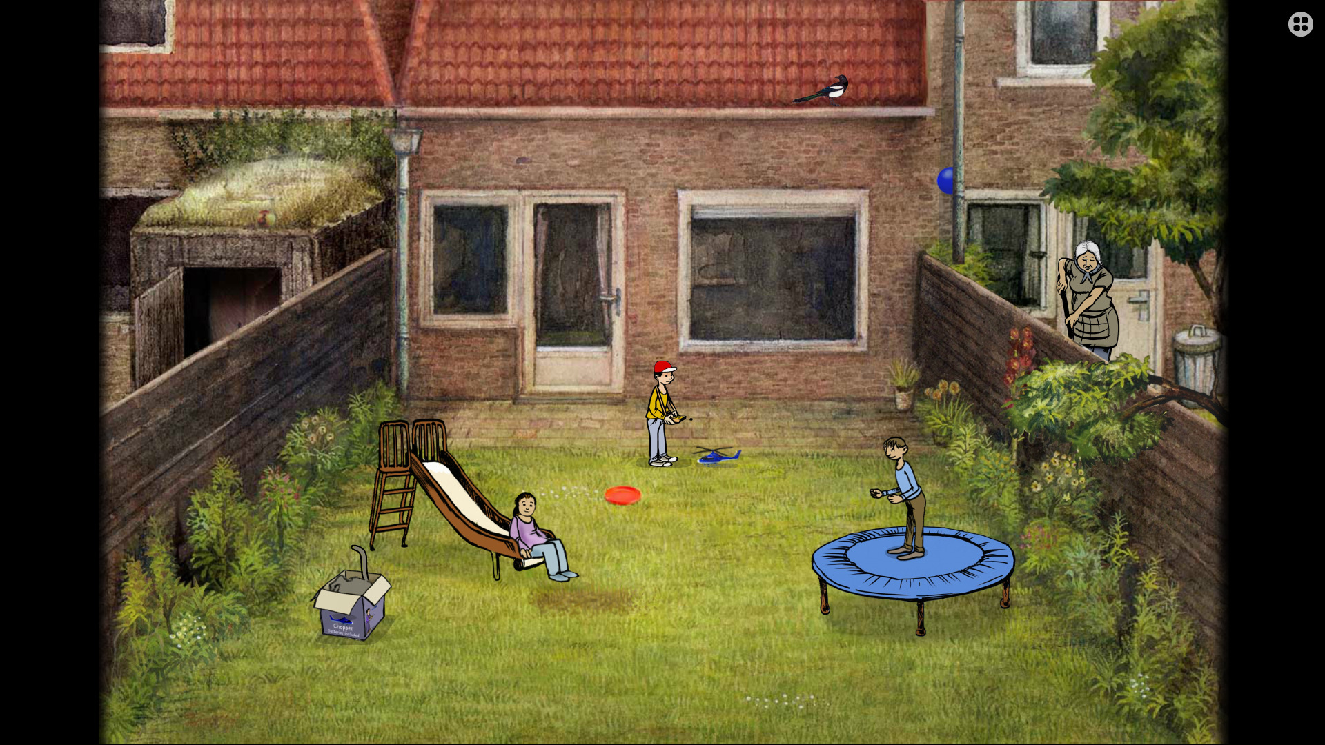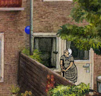 比如上面这一关,首先要点击直升机,将喜鹊吓到树枝上,再点击蹦床上的男孩三次,将喜鹊吓回屋顶,此时,围墙右侧老妇人的目光会跟随喜鹊移动,当老妇人看向屋顶时,迅速点击老妇人,将柱子上的蓝球弄下来。