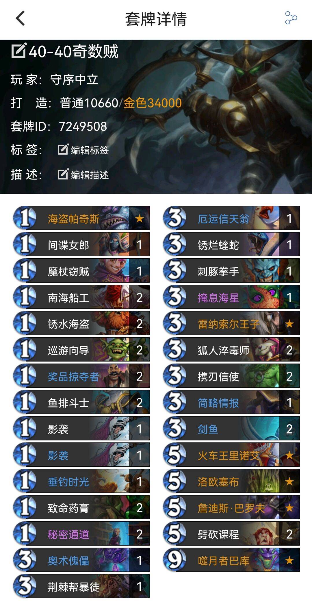 选择在版本末和大家分享这个套牌,是因为笔者在这个月用此套牌以奇高的胜率从黄金10一路杀上传说(48局37胜,胜率约77%),就连笔者自己都感到惊讶,因为在前几个版本中奇数贼的表现不是很优秀(大抵要归咎于暴风城版本的海盗战和沉没之城的剑鱼贼)而且笔者本身是个菜狗,上个月传说都没上去。