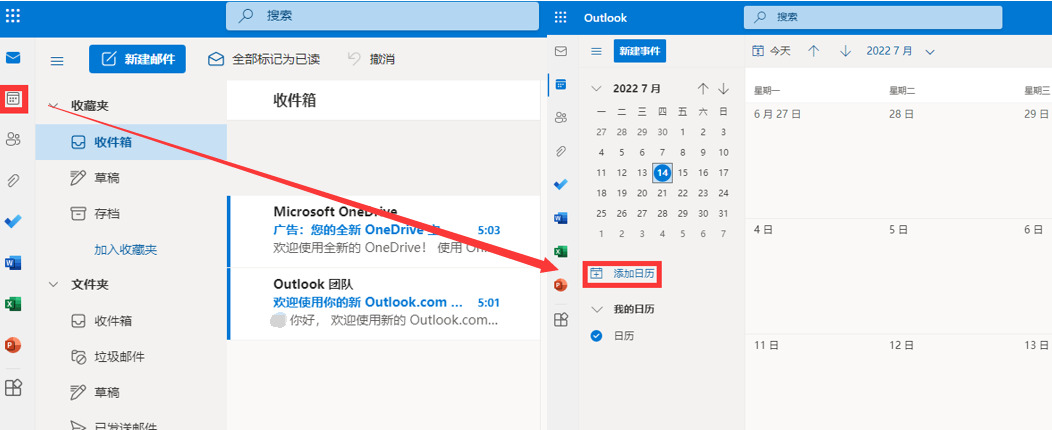 进入Outlook邮箱页面后,选择左侧的日历按钮,并在日历页面选择添加日历;