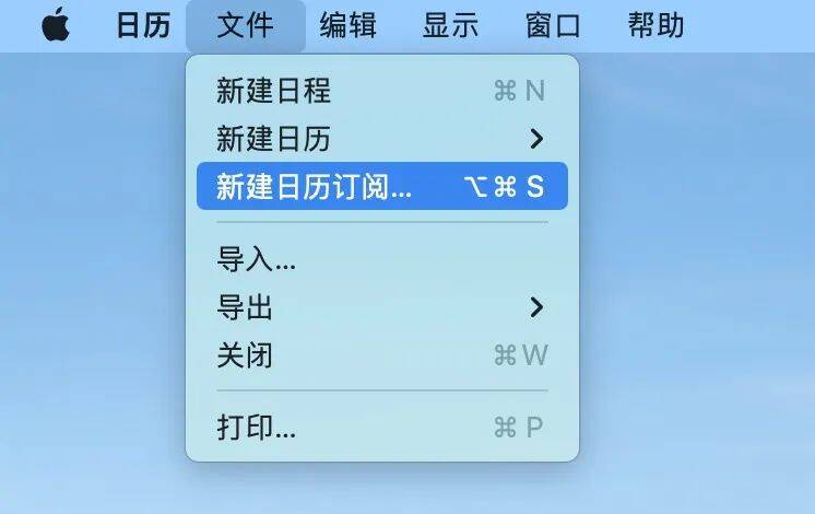 打开日历App,在顶部菜单栏的文件选项中选择新建日历订阅。