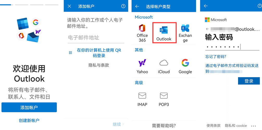 通过应用市场或者浏览器下载并安装Outlook,并使用订阅后的Outlook邮箱登录 ;