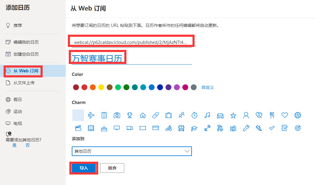 选择从Web订阅,将订阅链接粘贴到URL框中,填写日历名称后点击「导入」即可订阅。