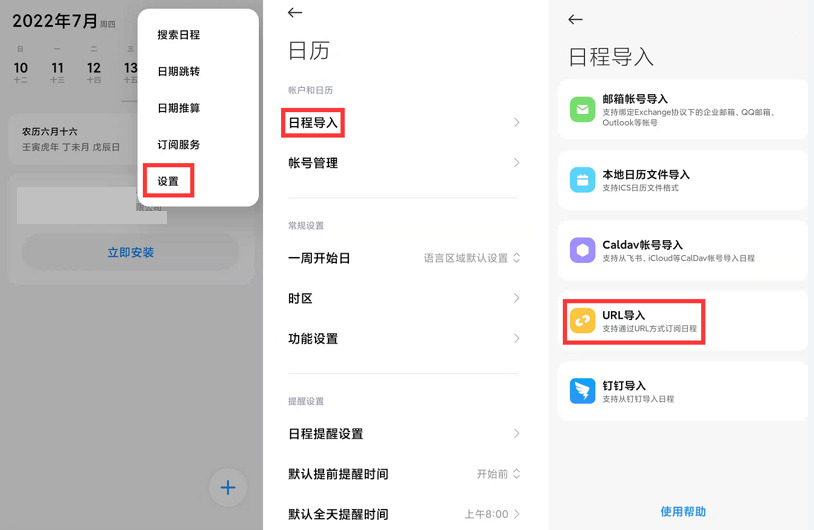 打开自带的「日历」App,点击「设置」(一般在右上角),在设置中选择「日程导入」,并选择「URL导入」选项;