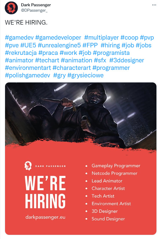 Ben是Dark Passenger的联合创始人,Pawel Kuleta担任首席运营官,Magdalena Furman担任3D角色动画师。目前,该工作室正在寻求招聘许多角色,包括游戏程序员、技术美工、环境美工和声音设计师。