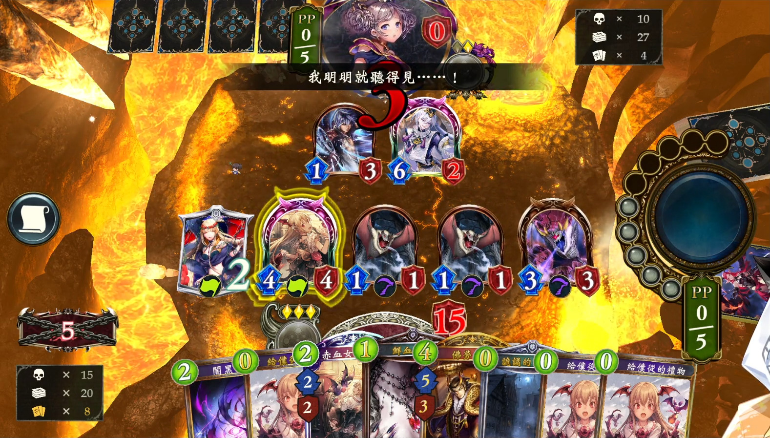 前期堆叠自残数,为瞬念召唤佛劳洛斯和炼狱之黑暗骑士做准备。留意自残数、场地数,尽量在第3回合双瞬召。利用场面优势抢血,并通过赤血女王·斑比、爱绝狂欲·瓦娜蕾格补刀。