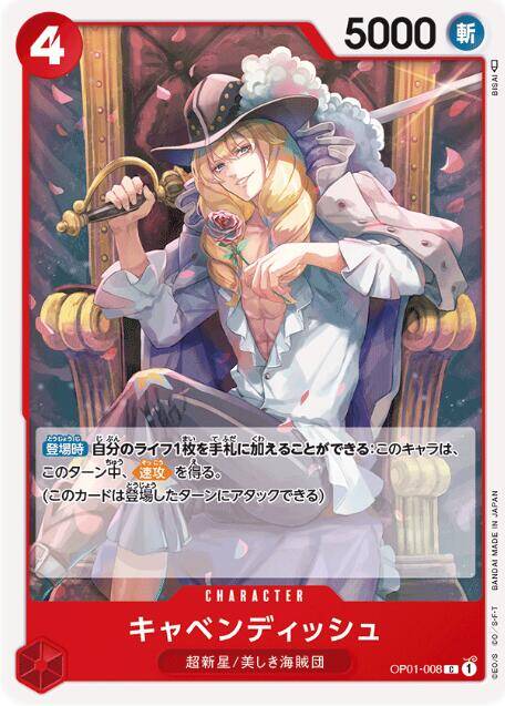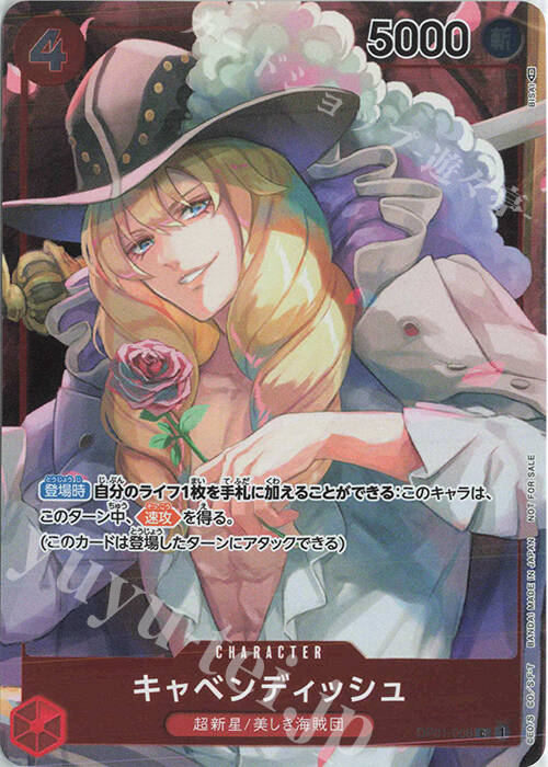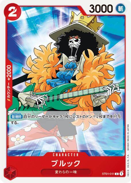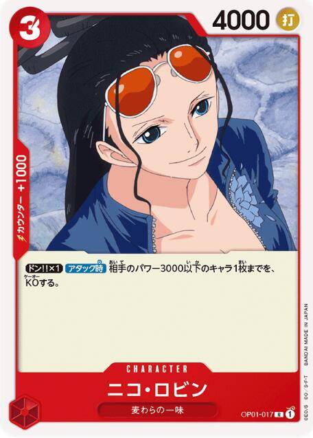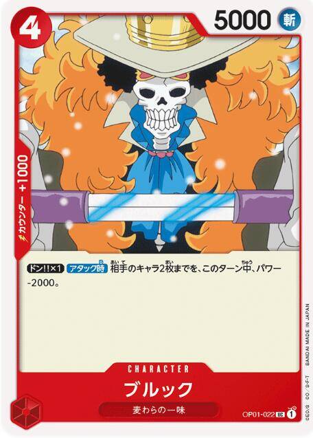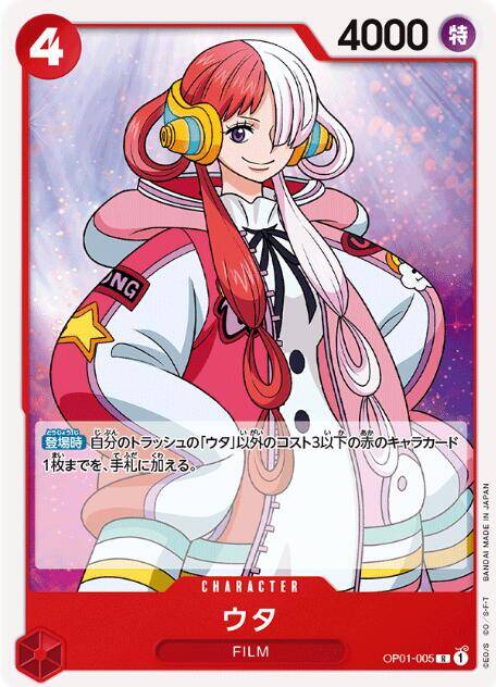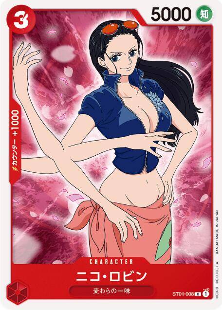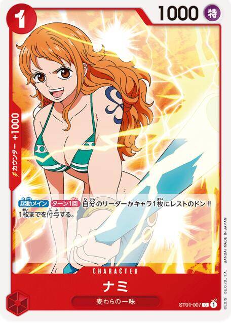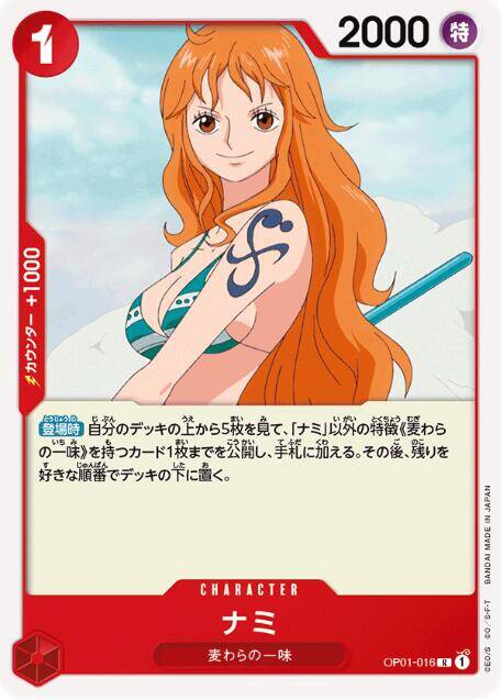【登场时】从自己的卡组上面查看5张卡片,公开最多1张除了「娜美」以外拥有《草帽一行人》特征的卡片,并加入手牌。之后,将其余卡片依任意顺序放到卡组下面。