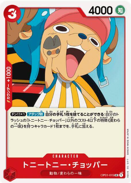 【咚!!×1】【攻击时】可以废弃1张自己的手牌:将最多1张自己废弃区中除了「多尼多尼・乔巴」以外费用4以下拥有《草帽一行人》特征的角色卡,加入手牌。