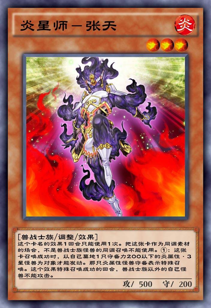 这张卡召唤成功时,以自己墓地1只守备力200以下的炎属性·3星怪兽为对象才能发动。那只炎属性怪兽守备表示特殊召唤。 这个效果特殊召唤成功的回合,兽战士族以外的自己怪兽不能攻击。3轴炎星的关键卡,张天在召唤成功时,可以将墓地中的董鸡特殊召唤上场。董鸡在因炎星怪兽的效果特殊召唤成功时,可以从卡组把1只炎星怪兽加入手卡。接着可以将等级3的调整怪兽张天与等级3的董鸡同调召唤出炎星侯-马信,并使用炎星侯-马信的效果,从卡组再次特殊召唤炎属性等级3的怪兽进行展开.炎星卡组需要黄金包2的3张炎舞天玑,如果没有的话可以考虑不抽.3轴炎星张天推荐2-3张,混轴炎星推荐1-2张即可.