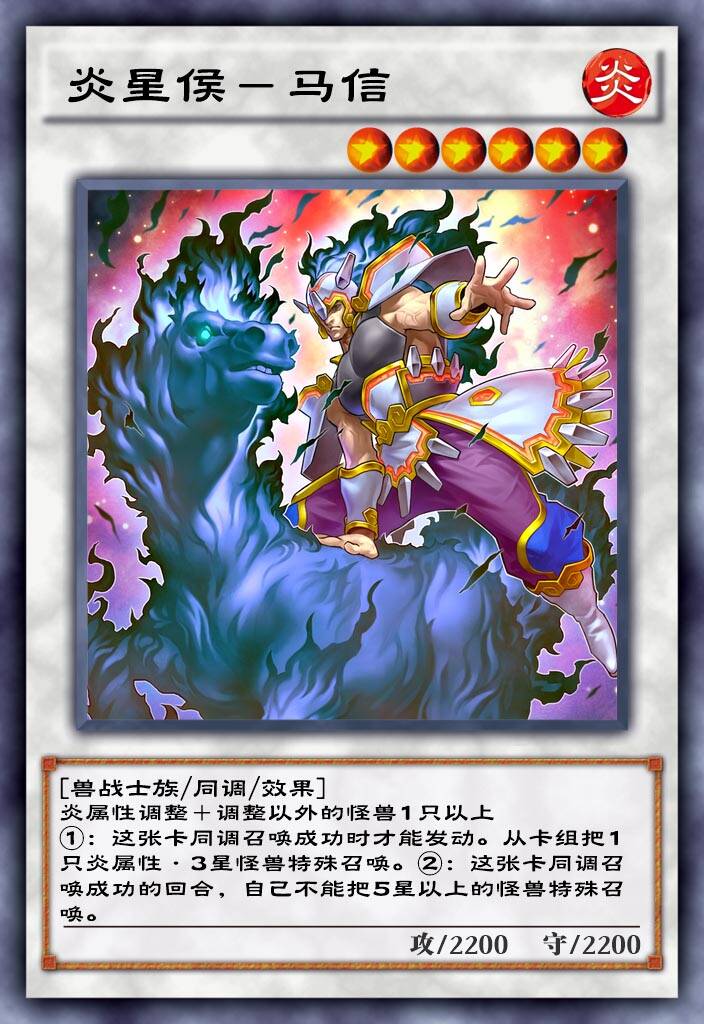 这张卡同调召唤成功时才能发动。从卡组把1只炎属性·3星怪兽特殊召唤。一般是张天拉墓地的董鸡,董鸡特招成功检索1张本家,马信再卡组拉一只炎属性3星,非常赚,但是炎星的问题在于解场和压制力没有得到解决,赚的卡不能转为收益,所以也是偏娱乐的卡组,推荐抽2张即可.