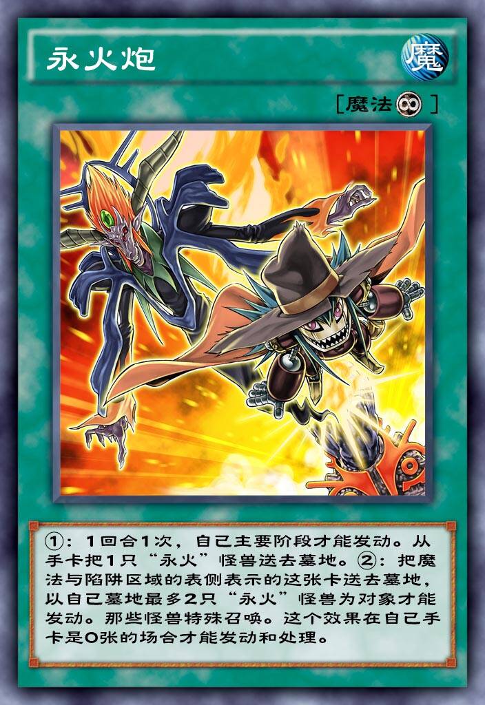 1回合1次,自己主要阶段才能发动。从手卡把1只永火怪兽送去墓地。 把魔法与陷阱区域的表侧表示的这张卡送去墓地,以自己墓地最多2只永火怪兽为对象才能发动。那些怪兽特殊召唤。这个效果在自己手卡是0张的场合才能发动和处理。 本家关键展开点,配合技能可以将手卡丢完并从卡组堆墓永火怪兽进行启动展开,不吃坑的话可以多次同调otk,想玩永火需要满3张.