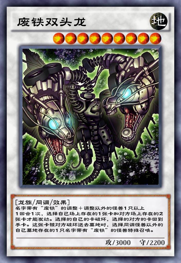 废铁双头龙1回合1次,选择自己场上存在的1张卡和对方场上存在的2张卡才能发动。选择的自己的卡破坏,选择的对方的卡回到手卡。 相比废铁龙可以多炸对面1卡,但是对面场上只有1张的时候不能发动效果,也限定需要本家调整怪,所以基本上只用于废铁卡组,可以根据场上情况选择出废铁龙还是废铁双头龙.2效果被对面破坏可以拉墓地1只非同调废铁怪兽为废铁同调怪通用效果可以防止被对面一波带走.玩废铁推荐抽1张,不玩可以不抽.