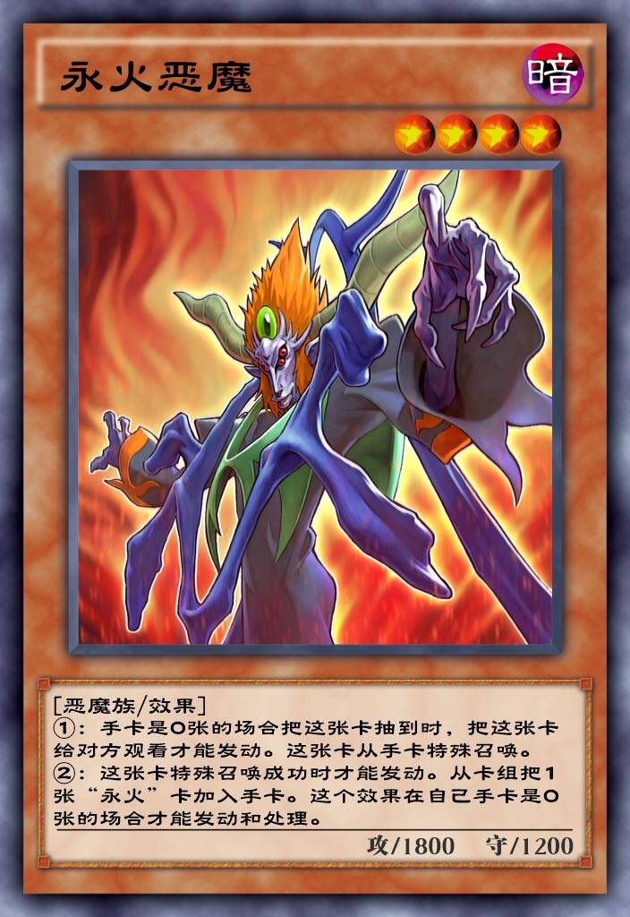 永火恶魔是本家核心卡片,手卡是0张的场合把这张卡抽到时,把这张卡给对方观看才能发动。这张卡从手卡特殊召唤。这张卡特殊召唤成功时才能发动。从卡组把1张「永火」卡加入手卡。这个效果在自己手卡是0张的场合才能发动和处理。目前国服要给的是暗鬼柳,因此构筑只需要投入1张恶魔加3张用火炮,等后期表鬼柳登场时才需要投入3张恶魔,因此想玩永火的小伙伴抽卡时记得不要没有出恶魔就重置卡盒,免得后期想玩又要重新抽造成不必要的浪费.