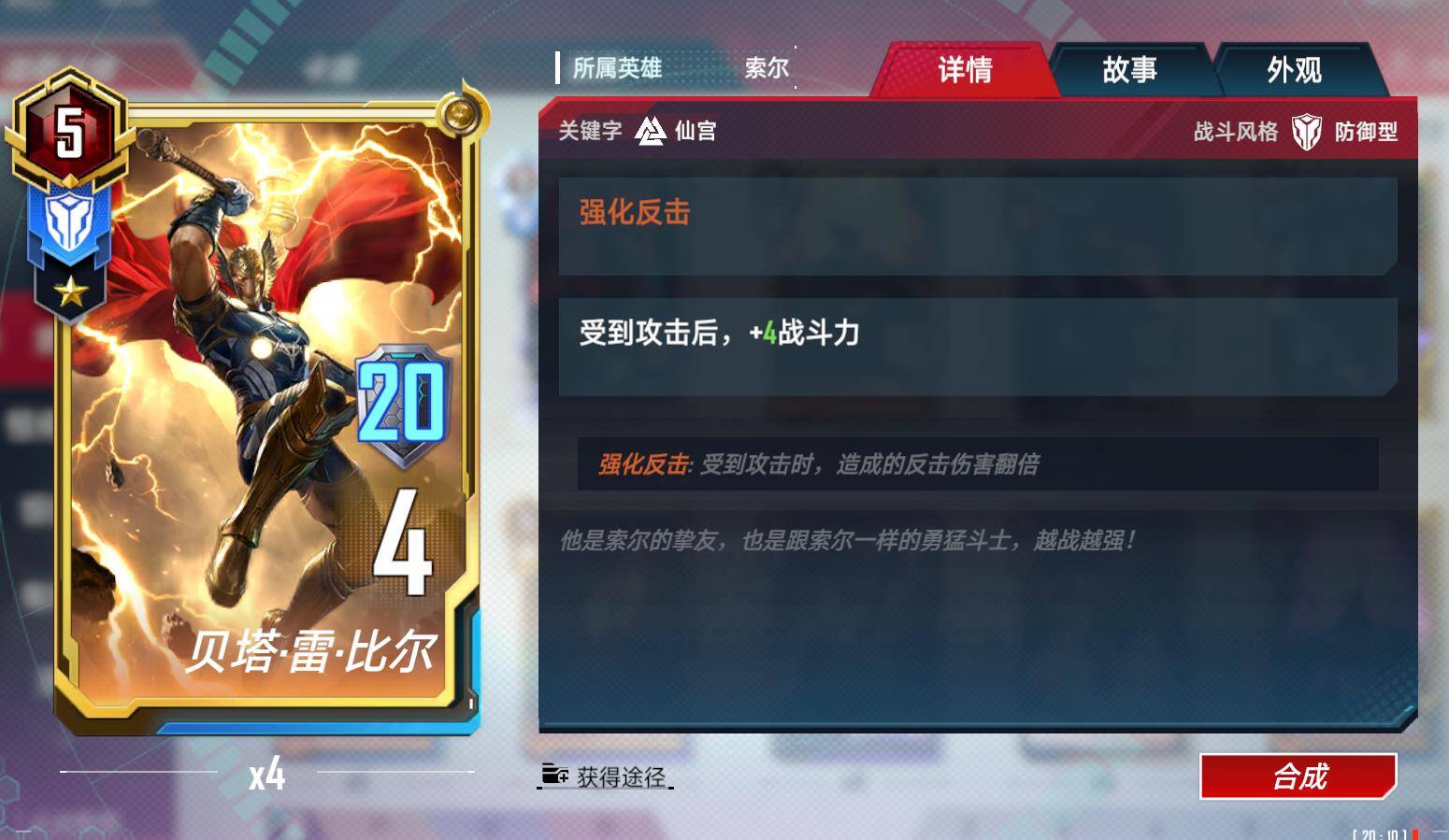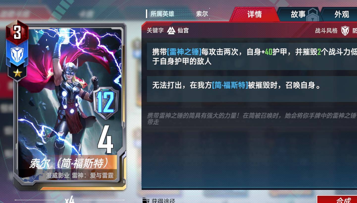 个人对漫威动画漫画了解得不是很多,剧情方面特意去百科查了下,知道女雷神是男雷神得女朋友?对决最大特色就是很多卡牌设计上都契合电影漫画。所以这个设计考虑到剧情互动?然后3本得女雷神能给本身很挤得索尔5本位置节约一个位置,提供锤子。当一个辅助也不错。