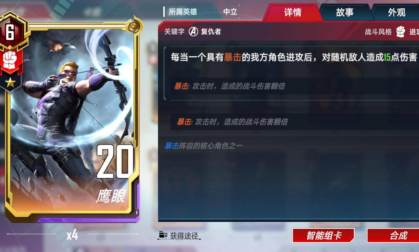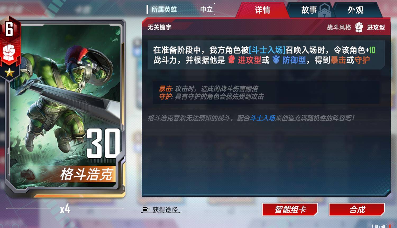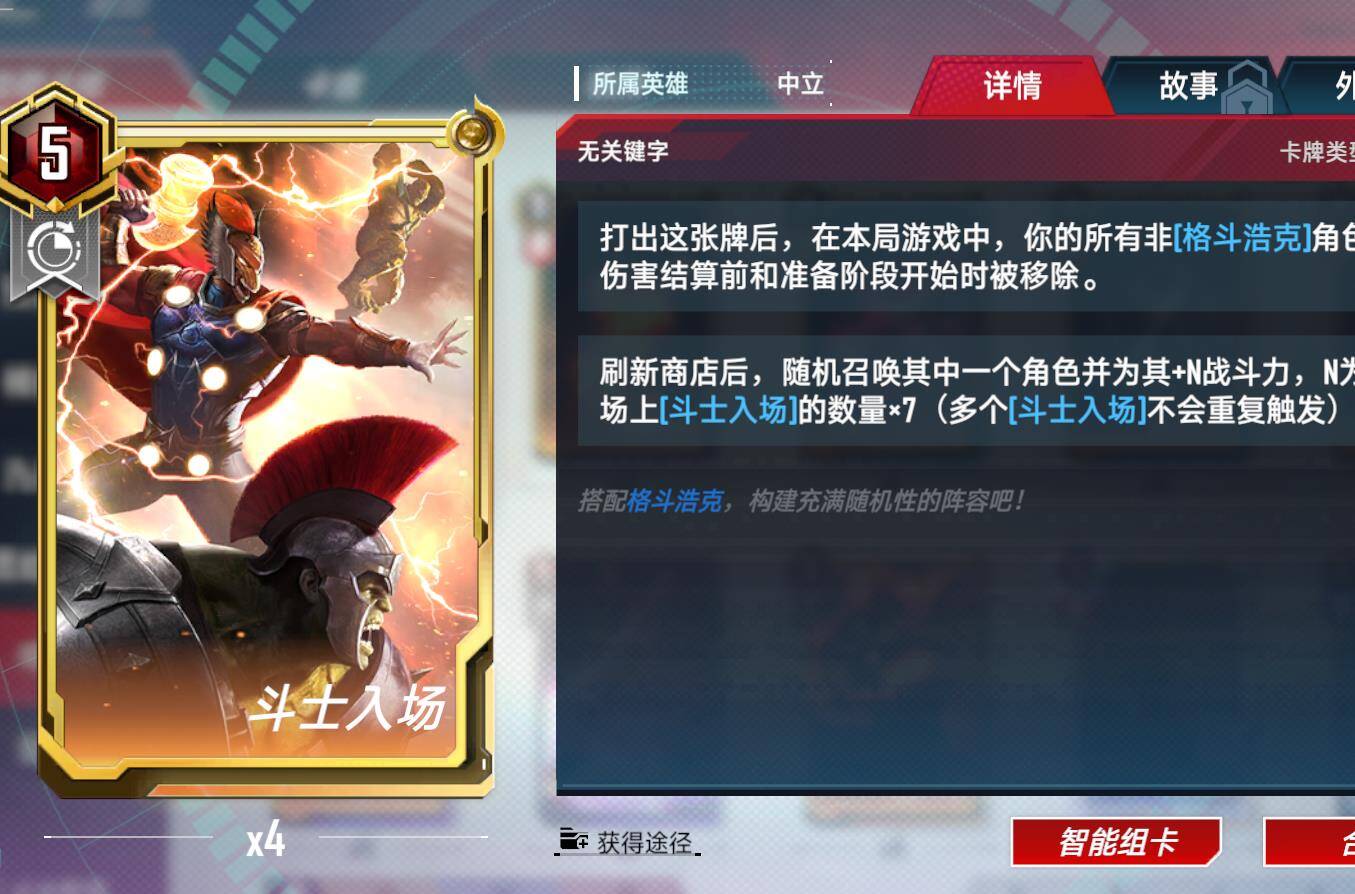 设计建议:斗士入场,所有浩克+4点战力,红浩克获得暴击,蓝浩克获得守护,格斗浩克可增加所以锁定卡20,40.60战力
