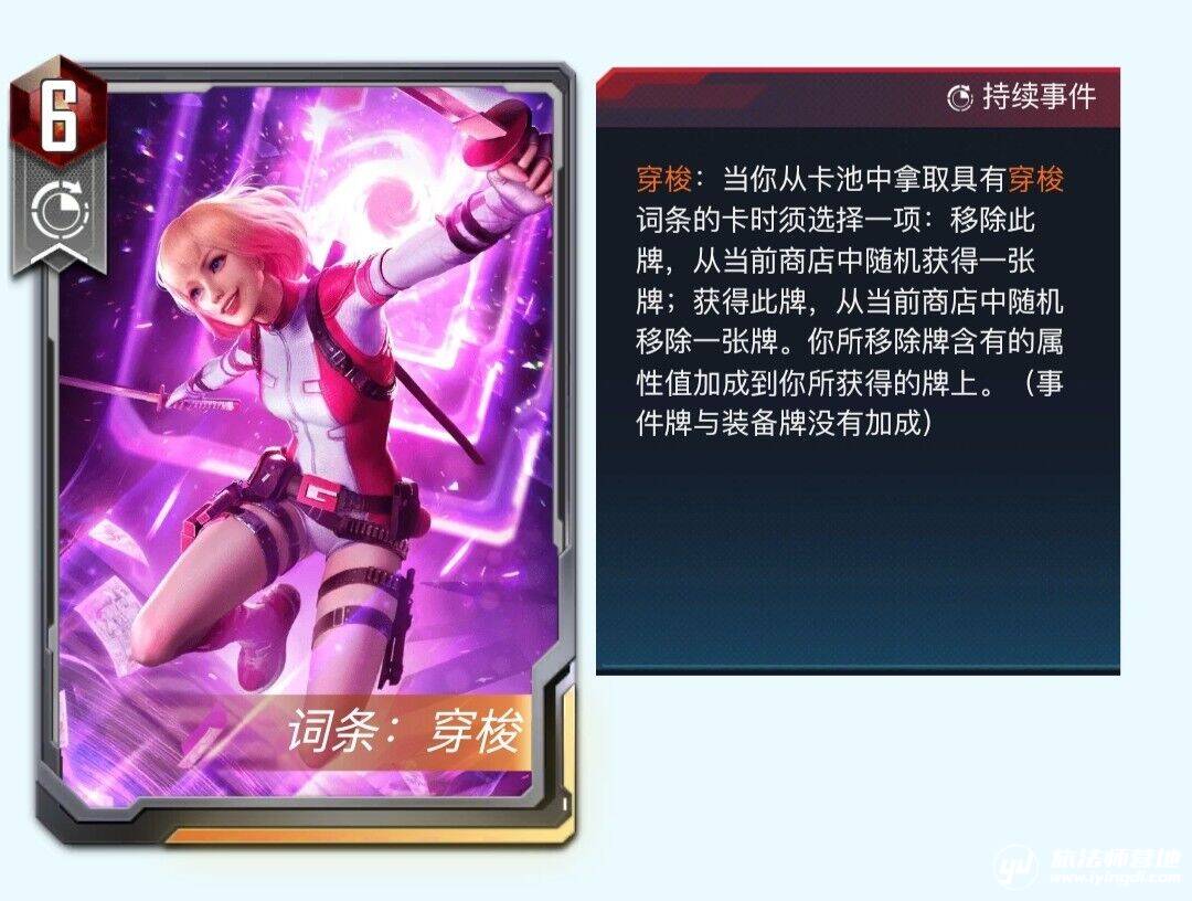 词条解析:“穿梭”机制横亘于拿取即获得(置入手牌)这一固定机制;当你选择拿取“穿梭”牌时就必须执行下边的效果,除非当前商店里只剩下一张“穿梭”牌;加成的属性值即移除牌的战斗力与护甲,不获得技能与词条