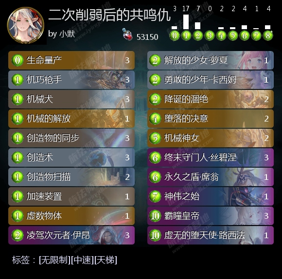 在多数对局中要积极寻找机械的解放,并选择合适时机使用,配合机械犬和其他1费造物大量过牌、堆叠共鸣数和进化数,进而通过虚无的堕天使·路西法、瞬念召唤机械神女建立场面优势,利用凌驾次元者·伊昂、勇敢的少年·卡西姆抢血。