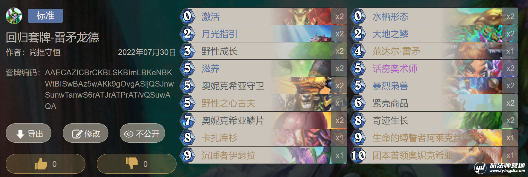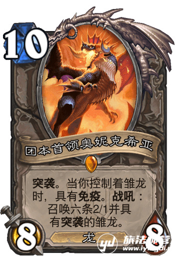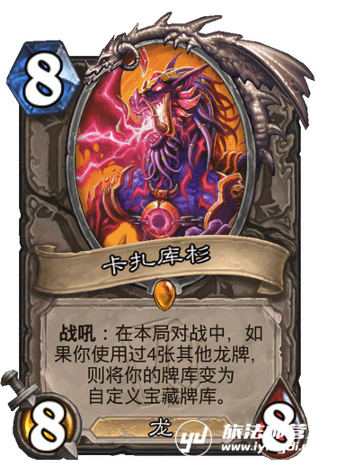小德的回归套牌是一套略显奇怪的雷矛龙德,套牌里有英雄牌古夫,这张卡是德鲁伊必带卡,且被社区一直声讨,有被平衡补丁的可能性(全额返尘?),此外还有卡扎库杉与团本首领奥妮克希亚(两张均为MINI包卡)。团本这张卡与新版本注能的契合度很高,理应泛用性不错;而由于新卡蒸汽清洁器的存在,故理性不看好围绕卡扎这种依靠衍生牌的套牌,在新版本之后的表现,基本卡扎会在角落里吃灰了吧。