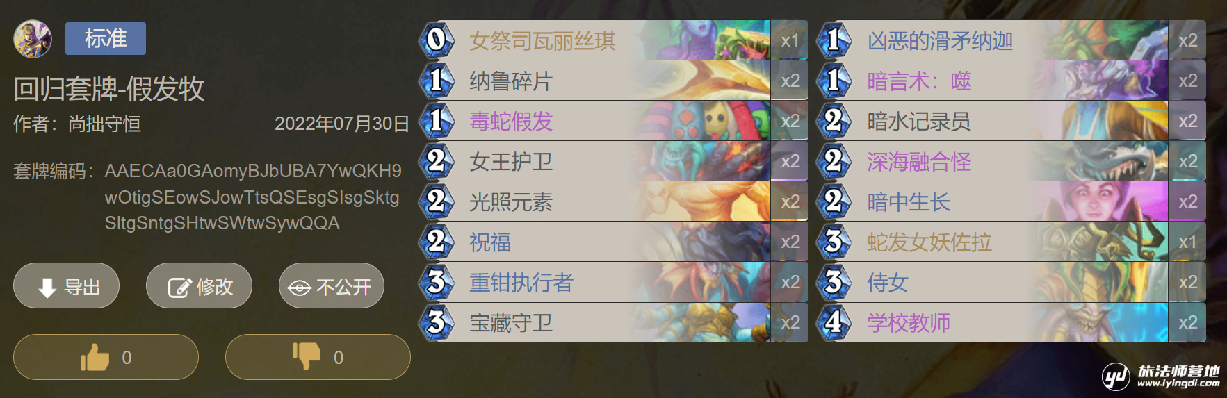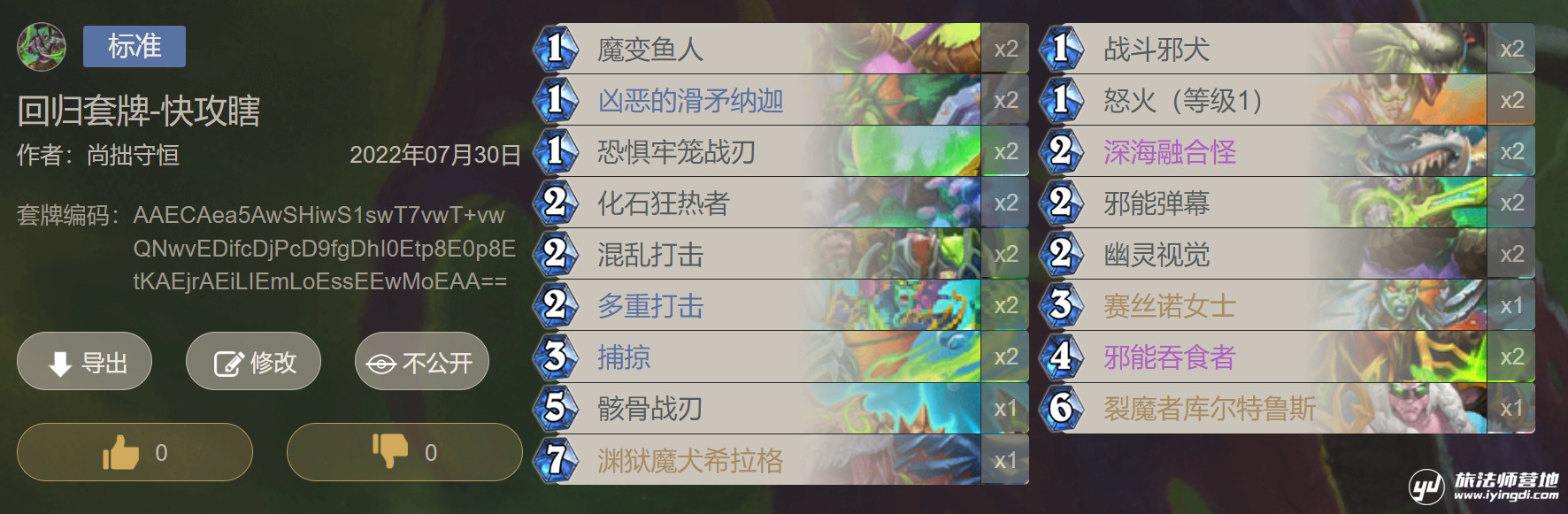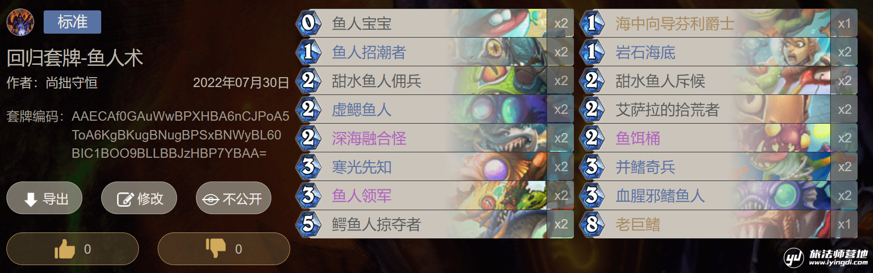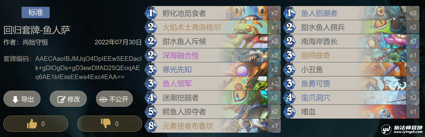 术士的回归套牌也是鱼人术,这套牌自始至终在沉没之城都没有大热过。套牌含中立橙卡海中向导芬利爵士(多头蛇年)与巨型橙卡(多头蛇年)。芬利作为置换手牌的中立泛用橙,在后续版本需要过牌的一些套路上,仍有发挥的空间。但术士的巨型橙卡则有点笨重,且与下版本主推的小鬼术契合度不高,因此很难进入构筑。