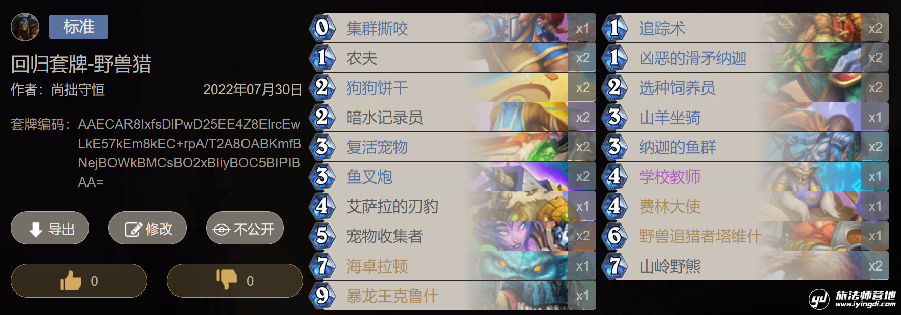 雷克萨的回归套牌是野兽猎,目前沉没之城版本末期胜率表现非常强势,也是猎人难得的中后期套路。套牌含英雄牌与巨型橙卡(多头蛇年)这两张橙卡,泛用性都还不错,但猎人新版本的卡牌整个预览季与试玩环节看下来,有点拉垮,故新版本表现可能会开始还债,新版本想要玩强势职业的玩家请谨慎选择。