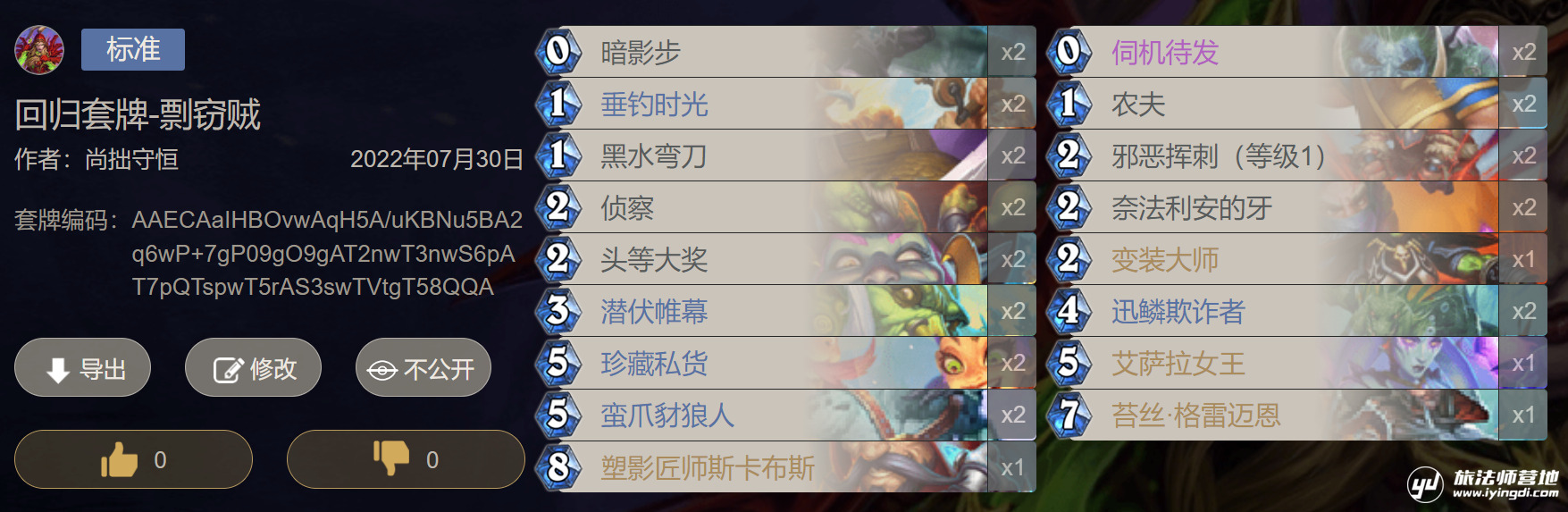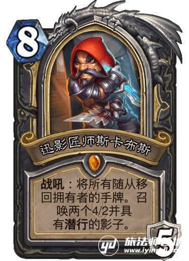 盗贼的回归套牌是一套剽窃大奖贼,有变装大师、艾萨拉女王(多头蛇年)与英雄牌三张橙卡。这套牌在沉没之城版本,强度与娱乐性俱佳,但新版本的设计思路是往奇迹贼方向,估计版本开放,大家都要去争相造出无敌“大范”,就与奇迹贼的相性而言,这三张卡都用不上。不过新版本前期群魔乱舞的热度过去之后,剽窃贼在新版本的强度,我们还犹未可知。