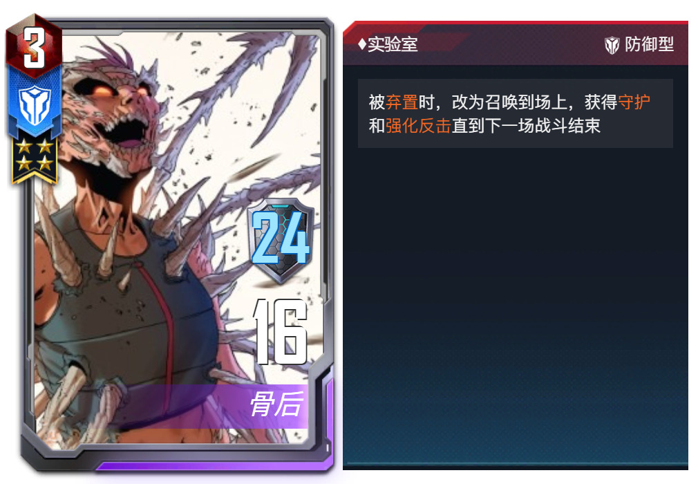 变种人之一,可以控制自身骨骼,弃置会特殊召唤,镀银魔像,守护和强化反击只能持续一回合,可以升星回手之后再次弃置触发