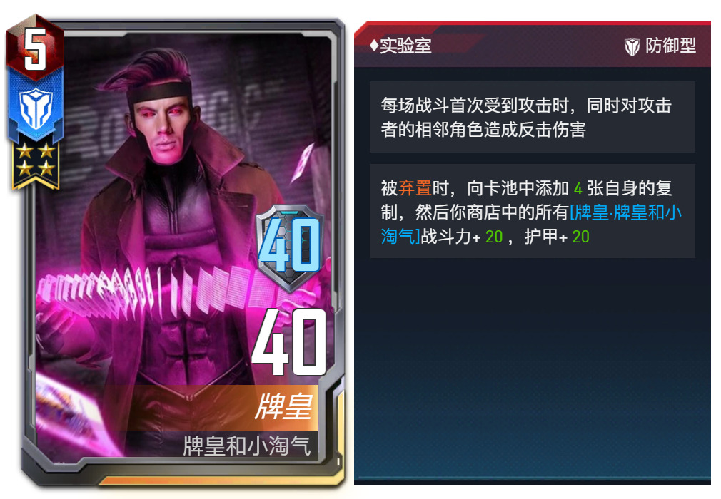 这套卡组的设计理念更加接近奇异博士套牌,是属于同一英雄的两个不同关键字。而和奇异博士不同之处在于,牌皇的两种关键字【盗贼】和【变种人实验室】代表了两种不同的词条和体系。
