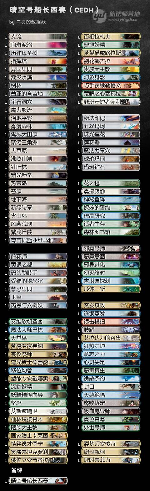晴空号船长西赛是一个非常有魅力的主将,因为其五色的包容性,几乎所有的EDHcombos都可以被包含在这套牌里面,所以西赛的套牌拥有无穷的魅力。同时西赛的能力让她能够导出各种其他的传奇生物(其他的各种指挥官),所以笔者盛赞她为指挥官们的指挥官。同时西赛的制胜方式有很多种,而不是单调的单卡/双卡组合技,身为”工具箱套牌“,可谓是万把无同局,希望大家能够加入西赛的大家庭来!一起发掘船长的魅力!