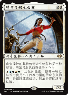 西赛的构筑思路,因为西赛搜寻牌库的异能依赖于西赛的力量(再给大家一个牌面 晴空号船长西赛),所以当场上没有其他带颜色的传奇永久物的时候,西赛的异能只能搜寻2费以下(不包括2费)的传奇永久物,所以接下来的构筑思考将先从传奇永久物开始。