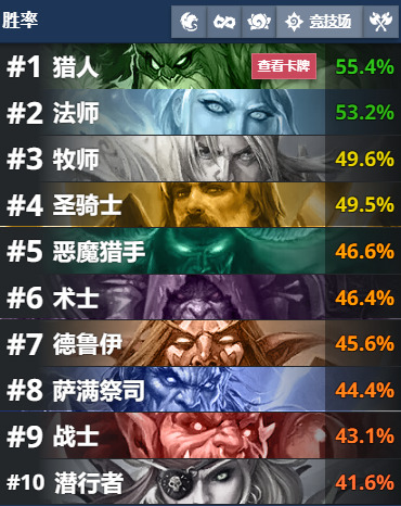 目前根据hsreplay上的数据,只有猎人和法师两个职业超过了50%的胜率,而且猎人更是以55%+的胜率一骑绝尘。相信大家最近几天竞技场都有被猎人射爆的经历,像阿里这套就是前期拉满,轻松打到渡劫。