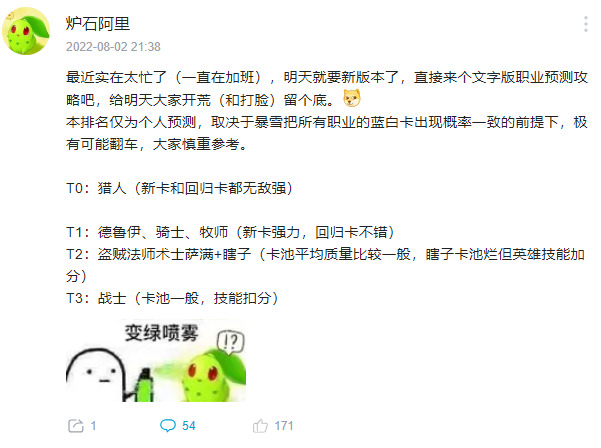 在这种环境下,猎人和法师的强势就很好理解了。猎人新卡补强的灵种体系,我个人觉得还好,虽然比较超模,但都是蓝卡和紫卡,并没到毒瘤的程度。登顶的最主要原因还是拥有着全职业最强的铺频率和控频率手段,新卡里两张白卡:狂暴利齿和狂蝠来宾都是优秀的铺场牌,契合环境并且高度配合新版本的注能词条。