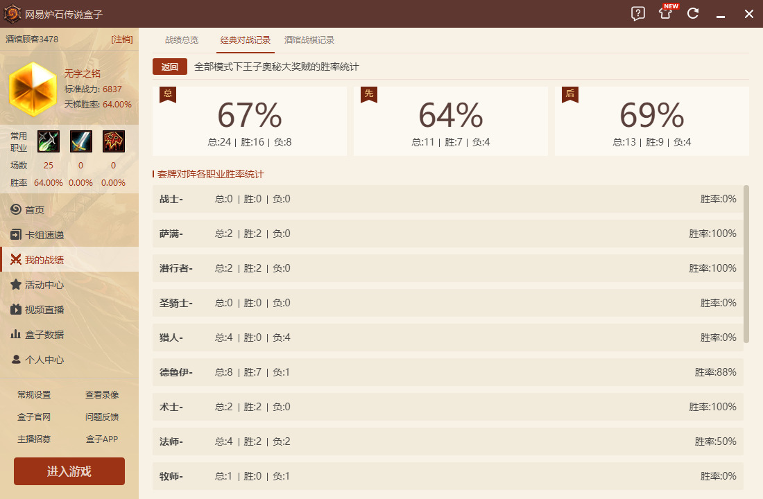 版本更新前我用30血构筑打到了钻3。版本更新后始终打不上去,就自己组了这套奥秘剽窃贼,8胜2负上传说。因为感觉比预想强很多,而且确实要靠信息差赢下热门卡组,就没发帖一直在不断优化卡组。由于猎人的崛起,胜率维持在62打不上去了,就先来发帖了qaq