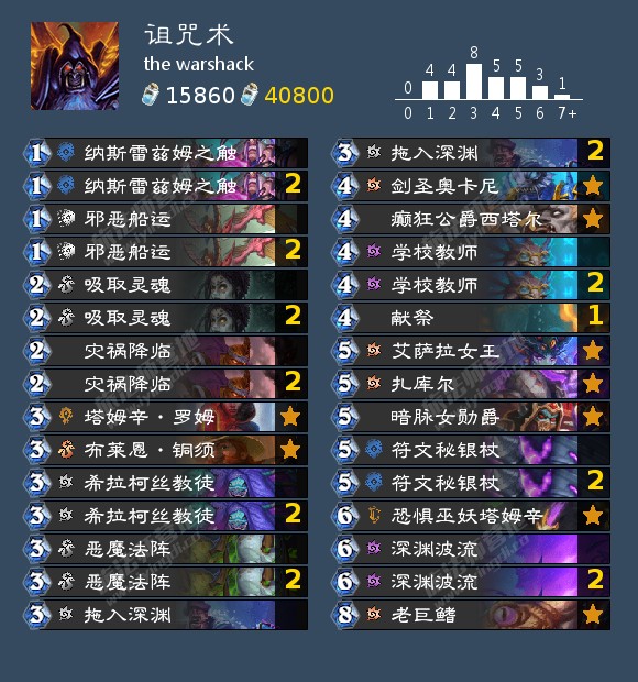 这卡组我玩了不少把,感觉挺无聊的,他能靠自己的控制体系赢一些不太胡的对手,但只要对手的T7猎前期顺下1贴23buff,或者萨满前面豺狼人进化,甚至是法师前面很胡,这个术士都招架不住,简而言之就是赢一些一般的对手,靠下限打一打但这个术士上限实在是太差了,还是整体思路太被动了。