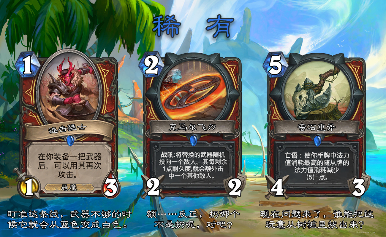 “搜寻武器,强化自己,然后碾压对手!坚韧的战士不但要掌握各种兵器,还应该有制造武器的能力。除此之外,岛上强大的嘲讽随从也能助他们一臂之力。”