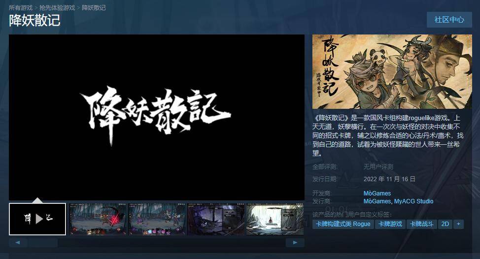 国风卡组构建肉鸽游戏《降妖散记》现已上架Steam,预计将于11月16日以抢先体验的形式发售,支持中文。