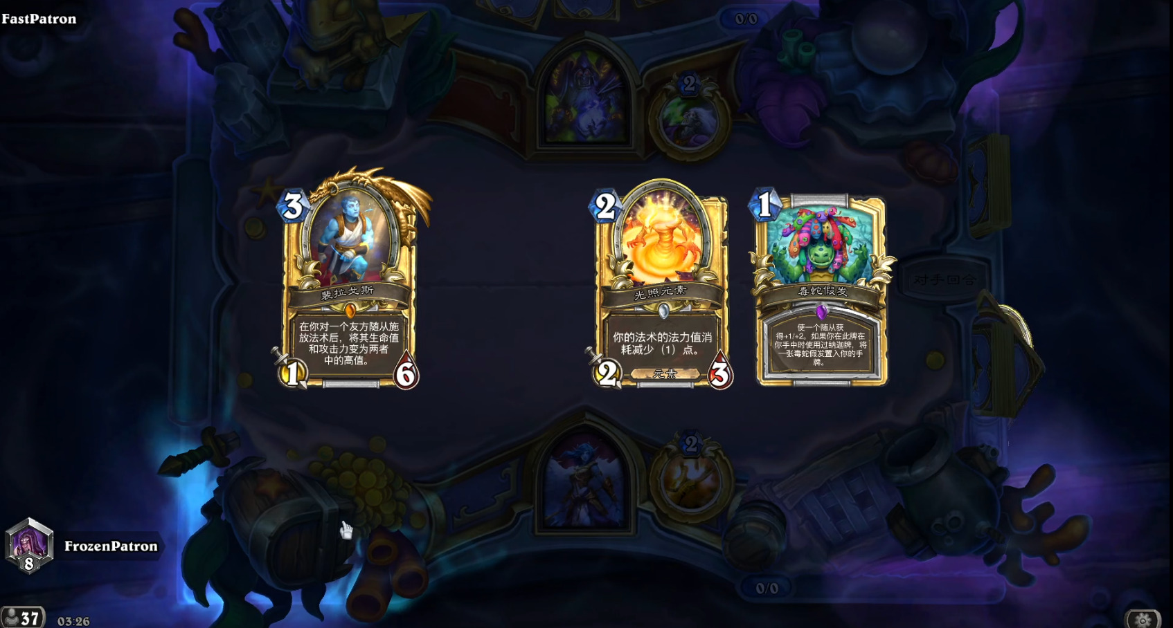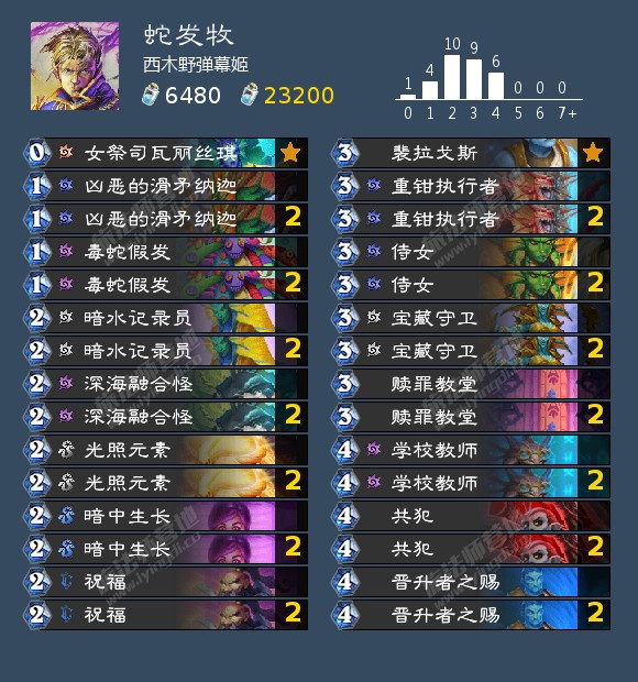 实战的时候我们尝试后手的时候留了一次裴拉戈斯+假发+哀黄的手牌,后来换来一张暗水记录员就直接胡了,3费88站场且后续的宝藏守卫也是个77,这个效果实在是太爆炸了,不仅场面巨大而且很方便这个思路的牧师继续滚场面的雪球。感觉是一张前中期上限非常高的单卡,蛇发牧还是比较需要这类型单卡的。