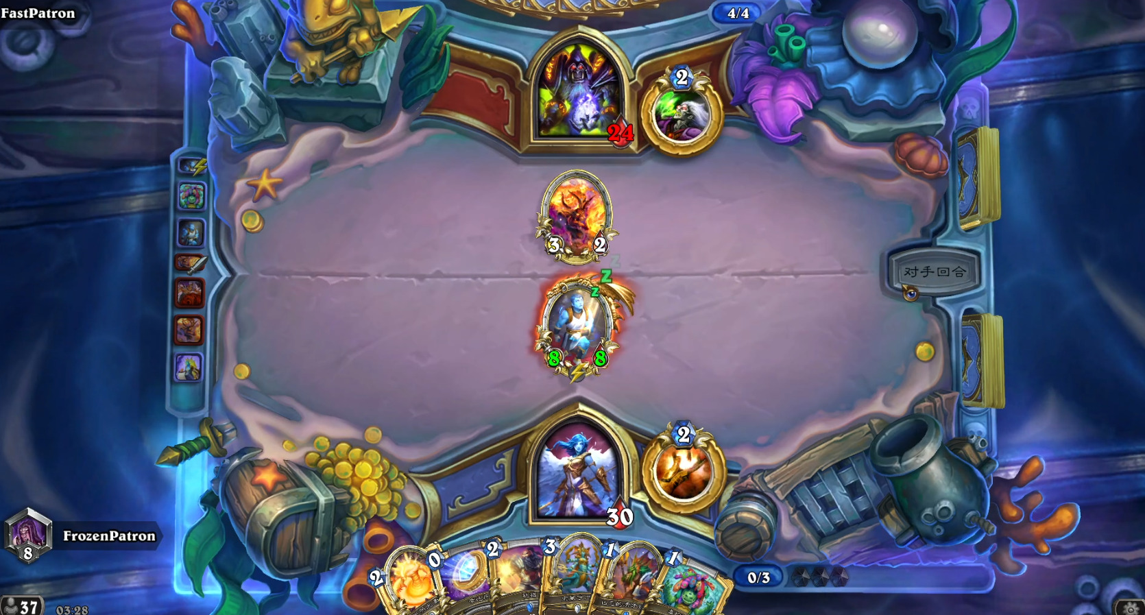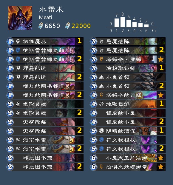 - 遇到的**术可以轻松的用这张牌配合1费的邪恶船运抽五张牌(玩过**术的老哥知道起手是会留邪恶船运的,很容易交易一次之后过5张牌),下面的实战视频里大家就会发现当术士提起符文秘银杖的时候斩杀是有多快
