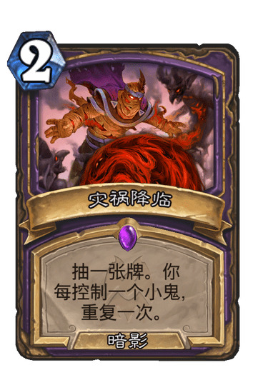 本次试玩我心里的第一强卡,没啥好说的,效果简单直接的爆炸。试玩的时候术士班的同学都将他称之为鬼刷作为和法师的考前刷夜对应,之前的考前刷夜是什么强度想必大家也都还记得。这种在特效构筑里能发挥爆炸效果的单卡只要稍微构筑一下就有很好的效果,这张灾祸降临也不例外,我描述几个实战场景: