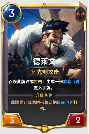 德莱文除了提供启动用的斧子之外,多余的斧子还能配合墓地医师过牌,配合卡特和破败清算者给对面很大压力。前期拍下德莱文会很有进攻性,而卡组地区是诺克萨斯加暗影岛都是有直伤的地区,对面不一定敢卖太多的血量,大概率会花费用处理德莱文,这就让这套牌的启动变容易了一点。
