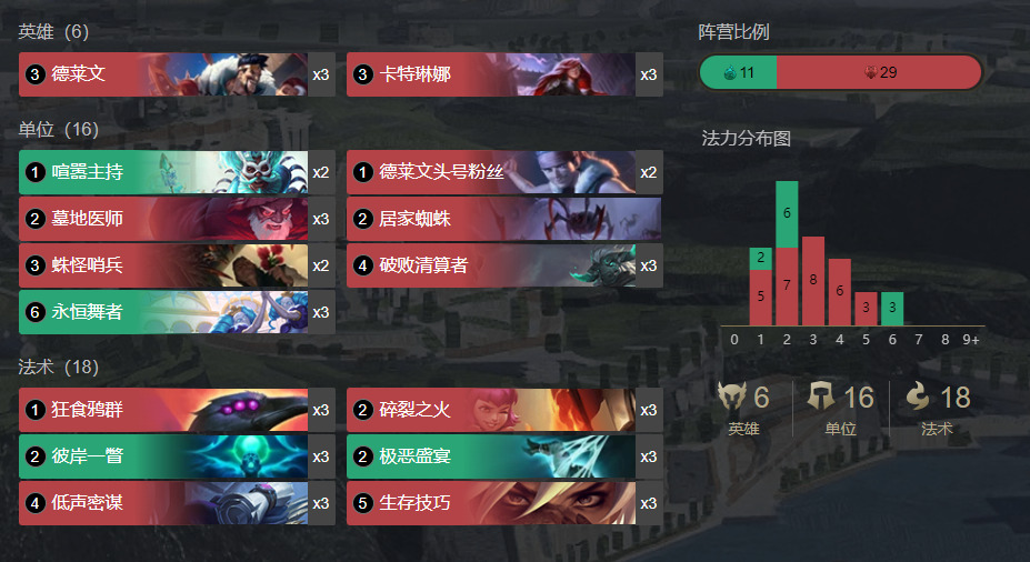 永恒舞者配合德莱文、生存技巧、破败清算者达成永动的思路在新卡预览的时候就已经被提出了,然而版本更新都过了3天了还是没有人使用这套卡组,在各种lor卡组网站都没有找到这套卡组。这是很奇怪的。我就自己构筑了一套,然后经过调试,发现强度挺高的。