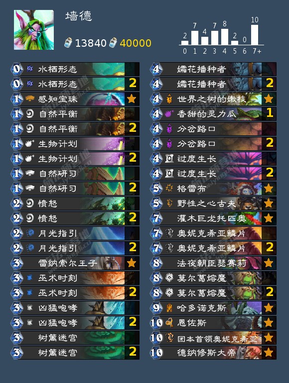原本这是一套无限墙德,但很可惜新卡试玩的时候没有测试到送葬者安德提卡复制星界猛虎和法夜朝臣瑟赛莉的时候联动的效果,故在这里的是一套更改后的普通墙德。新卡地标树篱迷宫,死亡之花践踏者,法夜朝臣瑟赛莉都推着德鲁伊走向亡语体系,而墙德是最适合德鲁伊的亡语体系,并且墙德的多随从也适合德纳修斯大帝作为另一致胜终端加入卡组。树篱迷宫拔高了卡组的抗性与上限,亡语随从登场即可立即触发亡语,无论是法夜朝臣瑟赛莉的多随从超展开还是莫尔葛熔魔额外的8点护甲都有可能成为终结对手希望的关键,可以说是最契合的卡牌。法夜朝臣瑟赛莉本体携带嘲讽也基本钦定了墙德的复苏。凭我个人试玩的感觉,我认为死亡之花践踏者并不能很好的适应狂野环境,相比之下我更希望在1费自然研习,3费过度生长后,6费打出古夫而不是下这张笨重的6费7/6。而且6血无嘲讽更加难以及时触发它所获取的亡语。灌木巨龙托匹奥我想重点提及一下这张卡牌,我在卡组中特地带上了香甜的灵力瓜正是为了定向检索这张卡牌,每施放一个自然法术就能够白嫖一个3/3的突袭,这对于强跳费但弱解场的德鲁伊来说是度过最困难时期的好帮手,往往只需要卖一个打出灌木巨龙托匹奥的回合就有机会在下一个回合中依赖突袭龙完成返场,也能够在手牌随从资源不够时依靠战吼特效给予对手场面压力,同时还能服务于第二致胜终端德纳修斯大帝,我认为是一张非常强力且大有作为的卡牌。