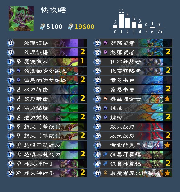 无疑,快攻瞎一定是最引人注目的体系,0费3伤的处理证据,2费4/4的案卷书虫,3费补牌神器放大战刃以及4费顶天身材7/7+特效的贪食的克里克西斯,将快攻瞎的上限界限突破到了一个全新的档次,你无法想象一个跳币244,二费出两个邪翼蝠完事三费还能提上放大战刃的瞎子有多么夸张。虽然突破了上限,但这样的构筑使得快攻瞎一旦卡手就会变成一套彻头彻尾的low卡组,在目前的狂野环境下基本不允许在2费回合打出2/2这样身材的随从,是一套方差极大的卡组。邪恶的厨师也是卡组值得考虑的单卡。