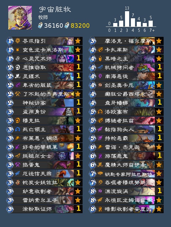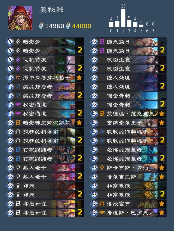 老外们的奥秘贼构筑使用的普遍是拉满低费的快攻奥秘贼体系,奥秘守护者,夺日者间谍这样的卡比比皆是,带上地标,在游戏前期就通过奥秘体系的节奏随从以及地标出的潜行随从完成场面压制。而且实战中他们真的牌序好的很离谱,往往三费就能造出来10+场攻的场面,这是我所不能理解的上限。哈尔吉亚斯给了奥秘贼非常优质的赖场手段,这里有一个思路是可以放弃疯狂的科学家,带上简略情报定向检索哈尔吉亚斯直接把他塞进奥秘里,也是很好的登场压制效果。