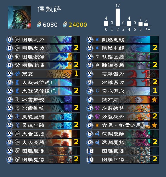派对图腾实在是要多亏有多亏,三费出一个03附带一个基础图腾,偶数萨表示我一费就能解决一个基础图腾,刚好剩余的两张补强卡石雕凿刀和锻石师(我不得不吐槽一句你是真的没有排名,作为橙卡都没有自己的名字,读者朋友们还能想起哪些没有自己名字的橙卡呢)都是偶数费用,偶数萨自然也要像老朋友奇数骑一样振臂欢呼。石雕凿刀应该是偶数萨整个构筑史上的后手跳币最有价值的一张卡,上个版本偶数萨收获了驻锚图腾后本以为能是新生,但后手一费摇技能,二费驻锚图腾+硬币摇技能的场面强度完全无法在现在的环境中立足,而下个版本萨满就可以利用石雕凿刀先解决一个随从,2费出驻锚图腾再砍一刀。虽然前后场面相同,但这凭空多出来的两刀打1就能够帮助偶数萨拥有对抗剑鱼贼的能力,顺带欺负隔壁老对手奇数骑,进而能够依赖buff巩固场面,而不单纯像现在一样上随从就要被对手无限白吃。锻石师属于加强版维西纳,完美适配偶数萨。试玩中我倒不觉得新卡图腾巨像有多么出彩,这张卡还是比较依赖分裂战斧的展开减费,大家把他构思成是+4费的深渊魔物就能够比较清晰的认识到它的登场回合。猜测偶数萨会和他的好哥们奇数骑有相类似的天梯位置。