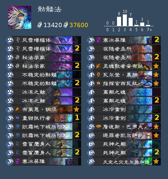 版本钦定套路kulou法,新卡试玩中非常多人试玩了kulou法,包括老李老师**火冲体系的,携带幻觉药水刷一堆kulou的,以及携带瑞文戴尔男爵轮番轰炸的,更有想法大胆的哥们贪到带恩佐斯和德纳修斯大帝,用天定之灾克尔苏加德或德纳修斯大帝来完成终结。就我个人试玩kulou法的感想而言,我认为kulou法中最强的一张牌应该是新版本给法师的优秀直伤冰冷之触,这张牌在实战中配合kulou的注能实在太能打伤害了,指挥官西瓦拉回手注能满的冰冷之触能够直接提供一张新的冰冷之触,只要注能3,这张2费打3就是一张可以分段打伤害的火球术,因此我更倾向于围绕冰冷之触来构筑kulou法。拉满的冰霜法术也能让其他单卡的收益达到最高,灵魂歌者安布拉/布莱恩·铜须+逐罪者凯尔萨斯+天定之灾克尔苏加德则是我选择的第二致胜点。