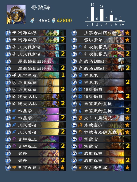 提供的第一套卡组是这个版本试玩中我们遇到的对手使用的40奇数骑,报告兵体系的骑士在新版本收获了晋升,罪恶的副厨师长,执事者斯图尔特以及餐会巨仆,而偏偏这四张卡里有三张卡是奇数费用,已经好久不出场的奇数骑表示我又回来啦!有了晋升和执事者斯图尔特以后,奇数骑在对局前期的场面能力更高了,多频率的骑士在进行场面交换时甚至能够仅仅依赖这两张单卡扭转曾经面对部分卡组时的场面劣势。我的预测是奇数骑也有希望在下个版本重新在天梯中出场,甚至还能比奥秘法高点。