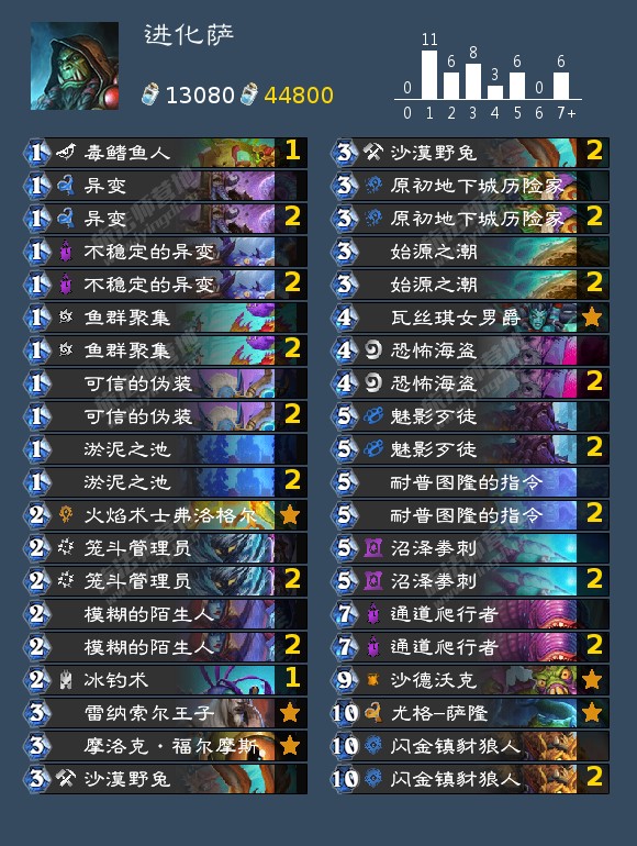 进化体系里,地标就像是排除进化错误答案的最佳选择,再也不用担心进化出末日预言者,暮陨者艾维娜这样损己利人的卡牌了。始源之潮这张集衰变与异变与一身的牌并不像预想的那么强力,有很多时候我们只需要一张衰变,或是一张异变足矣。淤泥之池注能完毕以后就和萨满的DK一样美好,但真的,我觉得这张卡的设计有点和进化萨的本质相违背,甚至还是注能4,本质上进化萨的场面交换就是尽可能地少损失随从,进行对己方有利的场面交换,然后再利用进化提升随从质量的同时变相的让随从回复所有生命值,优势局这张卡非常注能满,劣势局又往往连场面都没有,只能靠鱼群聚集来勉强拉一拉注能进度。另外比较遗憾的一点是我没有亲眼见证瓦斯琪女祭司的特效,翻的直播回放也没见,这个就要新版本上线大家自行尝试了。