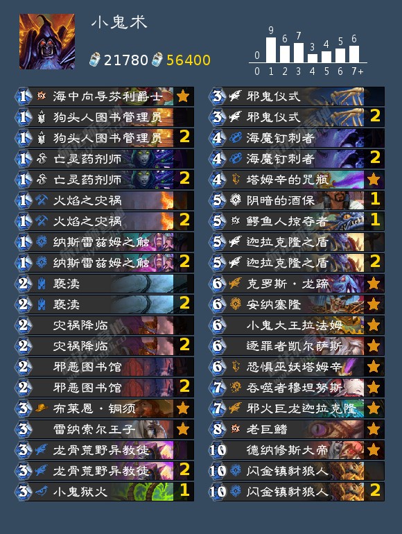 小鬼术和骷髅法一样,基本上所有的主播都试玩了这两套卡组,因此思路各有千秋,带着JK体系重振旗鼓的,走上快攻之路的 ,以及奶粉老师构筑的一套偏中速的小鬼术等等等等,思路之多令人咋舌。邪恶图书馆以及灾祸降临是小鬼术能作为成型卡组登场最重要的一环,并且我浅浅的预测一下下个版本开始,小鬼牌+灾祸降临将会成为术士大过牌的常驻体系。而且小鬼很难不让人想到曾经在标准横扫一方的邪火巨龙迦拉克隆,在一众实战中,JK体系的小鬼术也是表现的最全面的。首先,JK体系有用不尽的小鬼,除开邪火巨龙迦拉克隆可能带来的负面效果恶魔之外,能够保持不断小鬼节奏的也只有JK体系了,并且,JK体系无限适配新版本的小鬼大王拉法姆以及德纳修斯大帝。虽然JK体系的小鬼看上去一眼弱,但术士偷摸掏出一个场面buff可不是闹着玩的,私以为下个版本小鬼术走JK体系应是光明大道(其实是我们直播这套卡组暴打了一个老外,后来他在discord上私聊找我要这卡组,然后用这套卡组打了个五连胜,让我充满了信心)。
