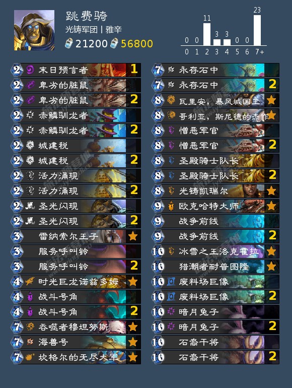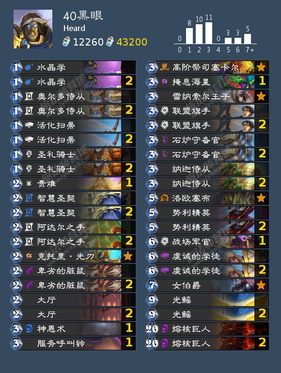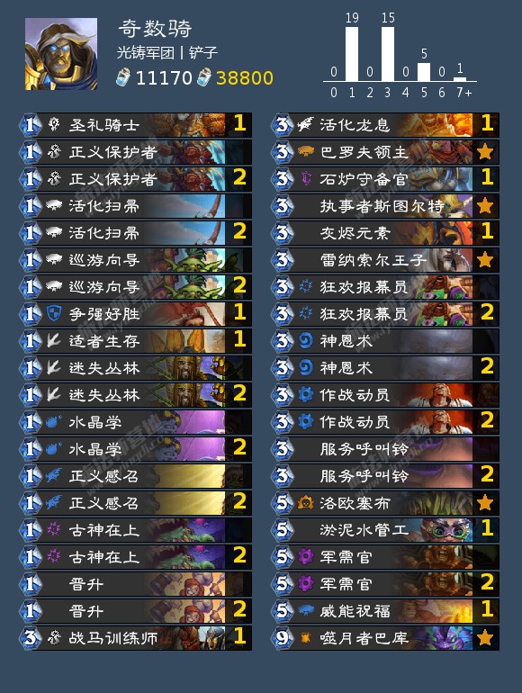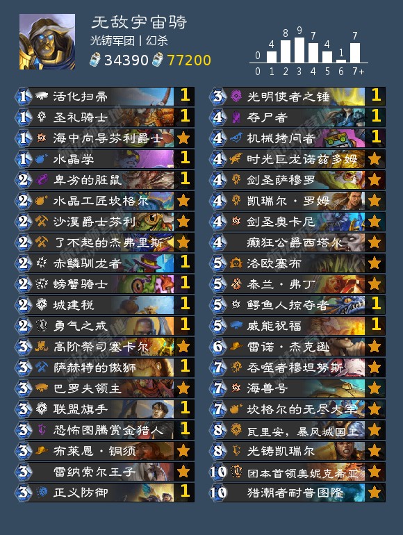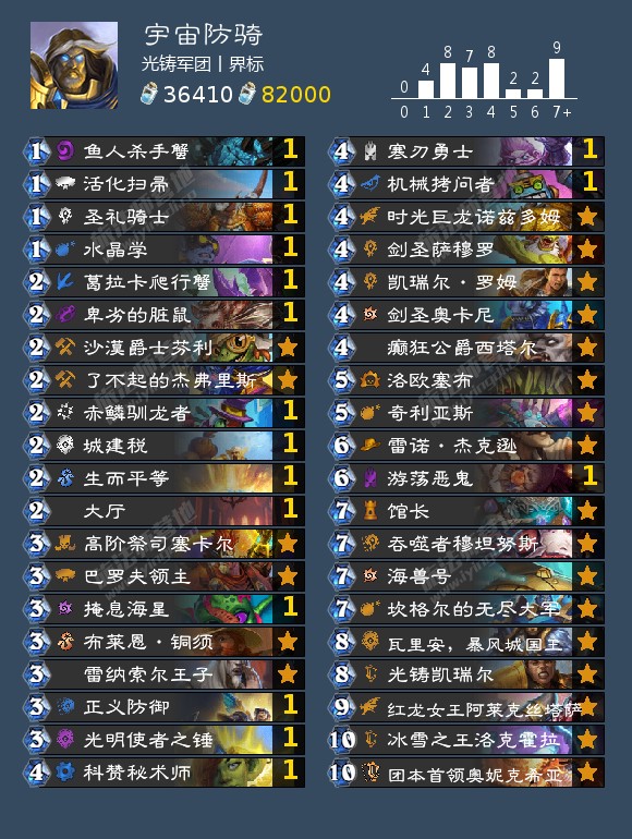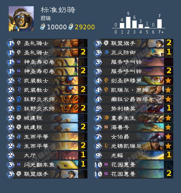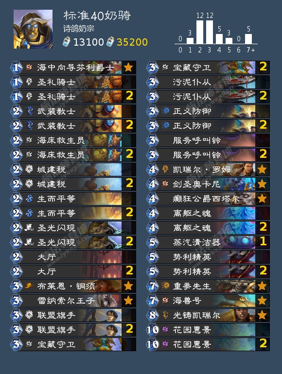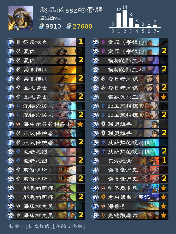 唔,说回骑士。目前比较适合携带这张卡的卡组是狂野的偏厚的宇宙骑和标准的奶骑。多出来的9张卡位,前者能更进一步优化卡组曲线与过牌链,同时多10血也更不容易被快攻抢死(抽不到雷诺这点上其实区别不大×);后者则能在原基础上携带更多质量组件,或是优化过牌链,增加制胜手段等等等。