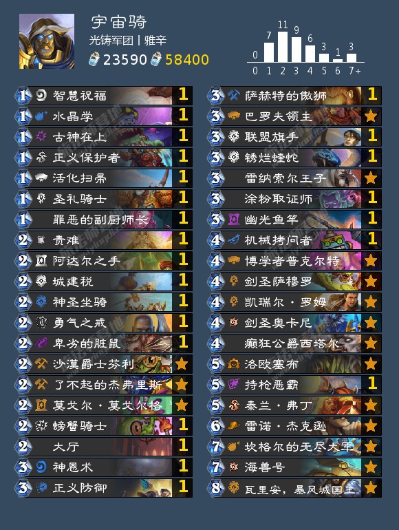 阅兵类骑士的小核心,地位类似于救赎者洛萨克森,能额外消耗对手的资源,并给到更大更持续的场面压力。单卡本身收益还是相当不错的——就算只看下限,每回合英雄技能2费出一个4/4,也很够看。缺点是3费出一个3/3对阅兵类圣骑而言有些亏节奏,难以稳定上手甚至因为费用原因不好检索,以及会吃到沉默。